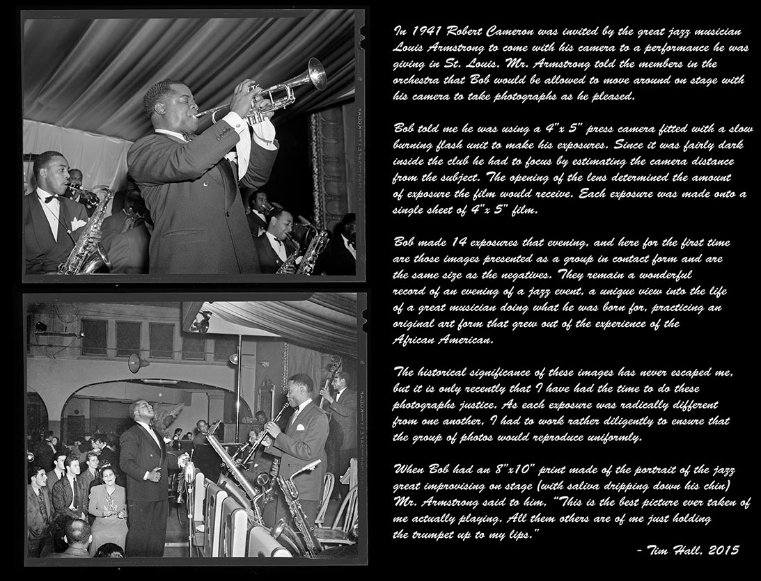 Given free-reign to move around on stage during the performance, Robert Cameron used a 4x5” press camera — fitted with a slow burning flash unit — to make his exposures. Since it was fairly dark inside the St. Louis club, he had to focus by estimating the camera distance from the subject. The opening of the lens determined the amount of exposure the film would receive. Each exposure was made on a single sheet of 4x5” film.